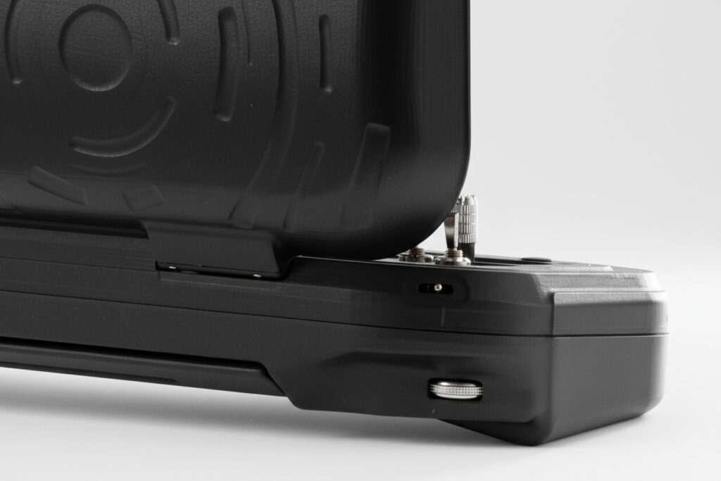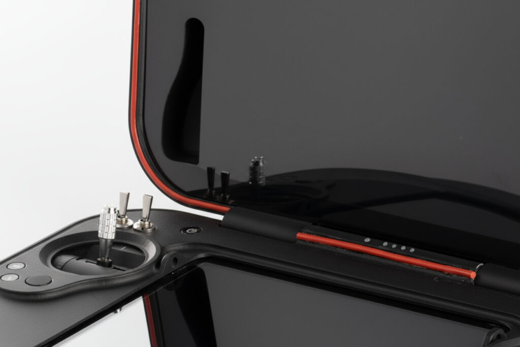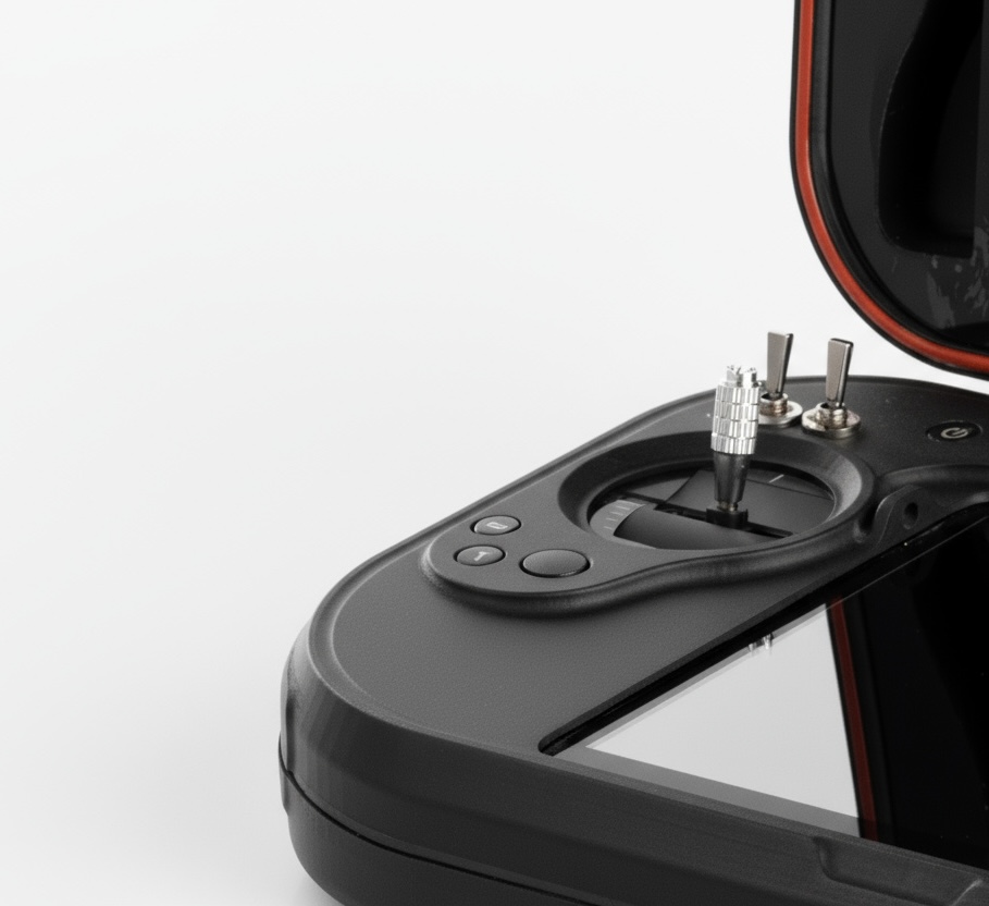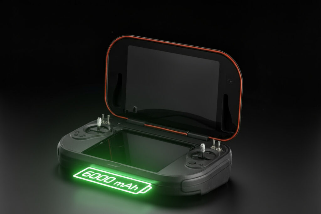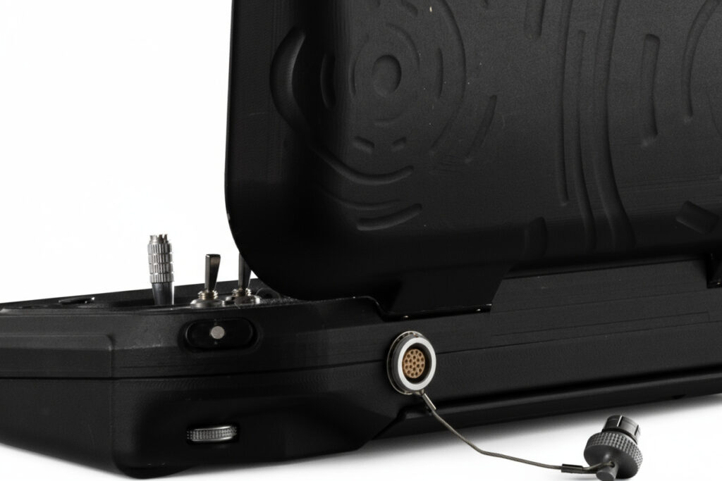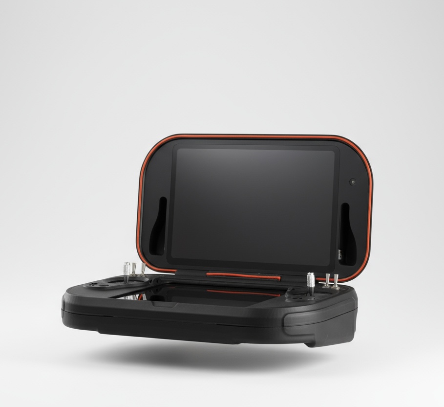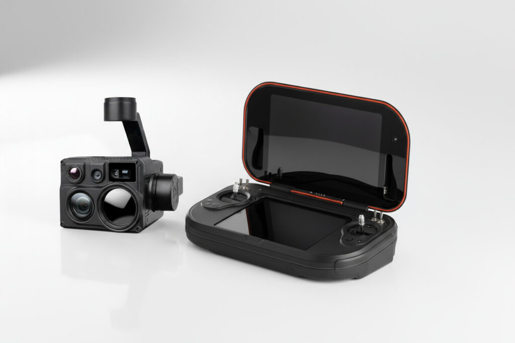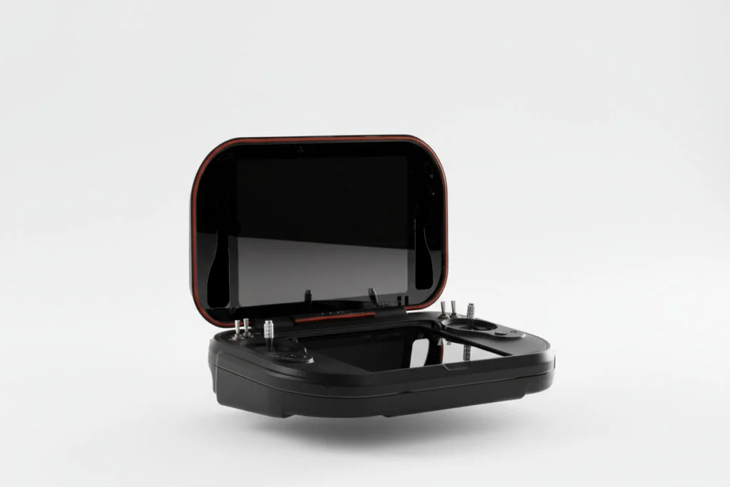 MUG-101 has two top and bottom LCDs, two joysticks for the drone control, and two other joysticks for payload control. Multiple keys and knobs are also included to control the payloads.
